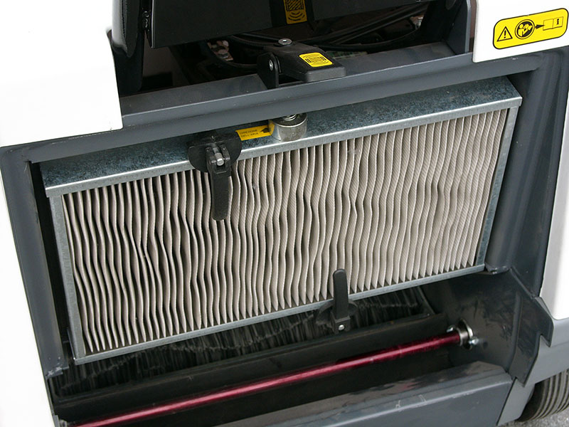 Il sistema di filtrazione assicura che la polvere resti all'interno della macchina e nel contenitore, grazie allo speciale scuotifiltro meccanico. L'operatore può accendere e spegnere la turbina di aspirazione, a seconda delle condizioni del suolo e delle diverse esigenze.
