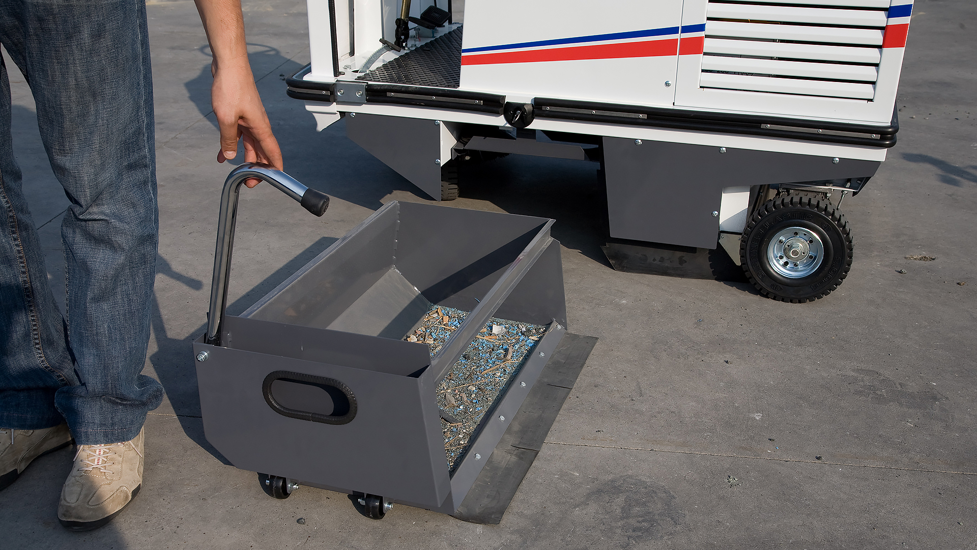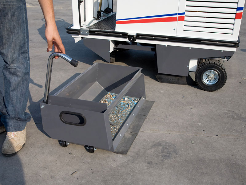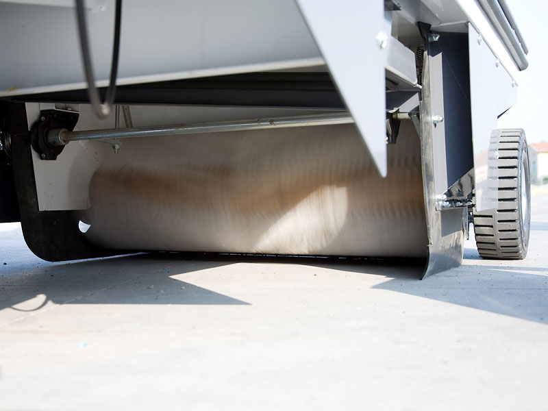 L'azione delle spazzole lancia polvere e rifiuti in un contenitore di grande capacità. La polvere viene aspirata da una potente turbina che la manda verso il filtro. La particolare conformazione del filtro garantisce la reimmissione in ambiente di sola aria pulita.